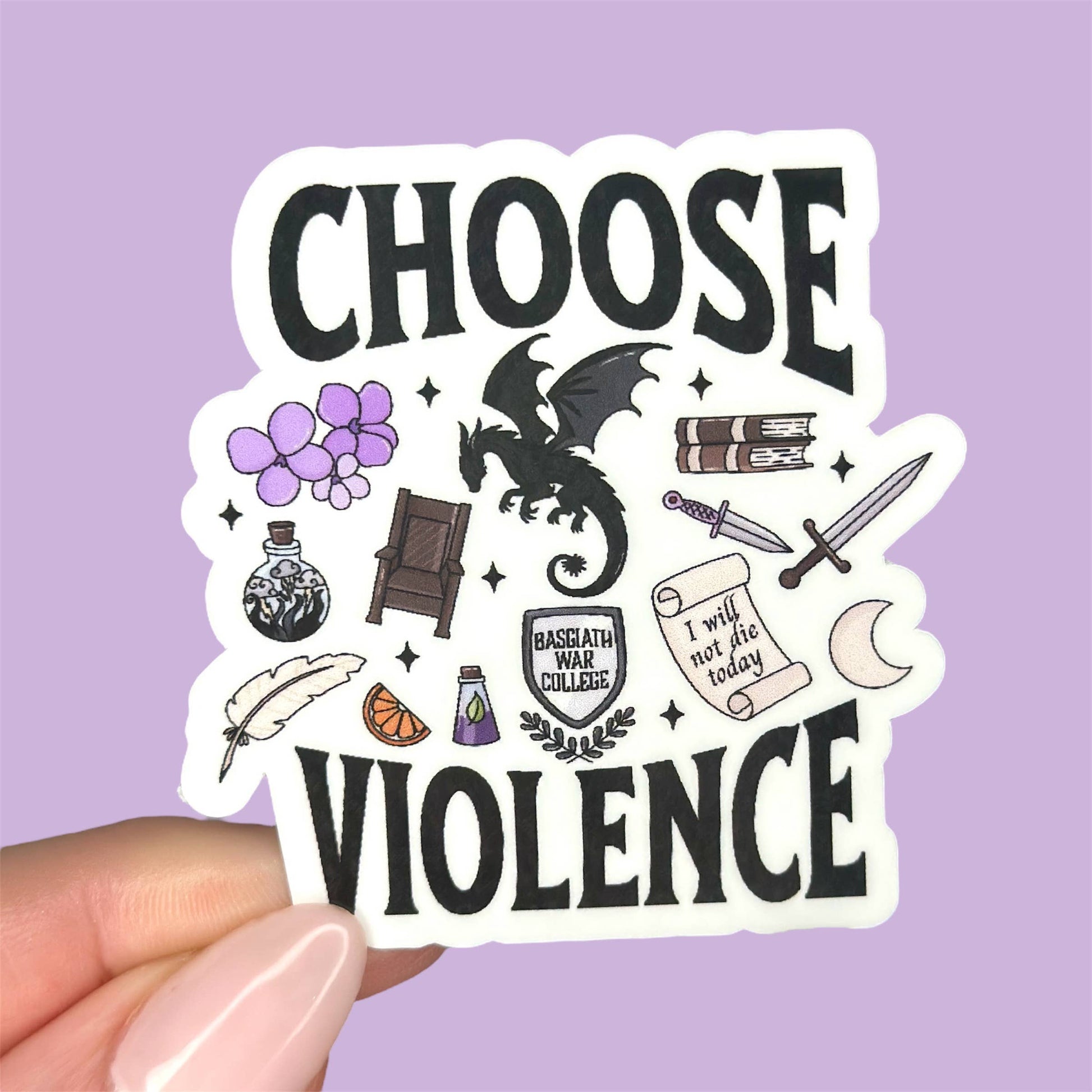 Show your fierce side with the Choose Violence Sticker, inspired Fourth Wing! This romantasy-style sticker captures the spirit of toughness and tenacity, perfect for fans who love a little chaos with their bravery. Stick it on your laptop, water bottle, or journal and let everyone know you're ready to face whatever comes—with a smile and a little edge.